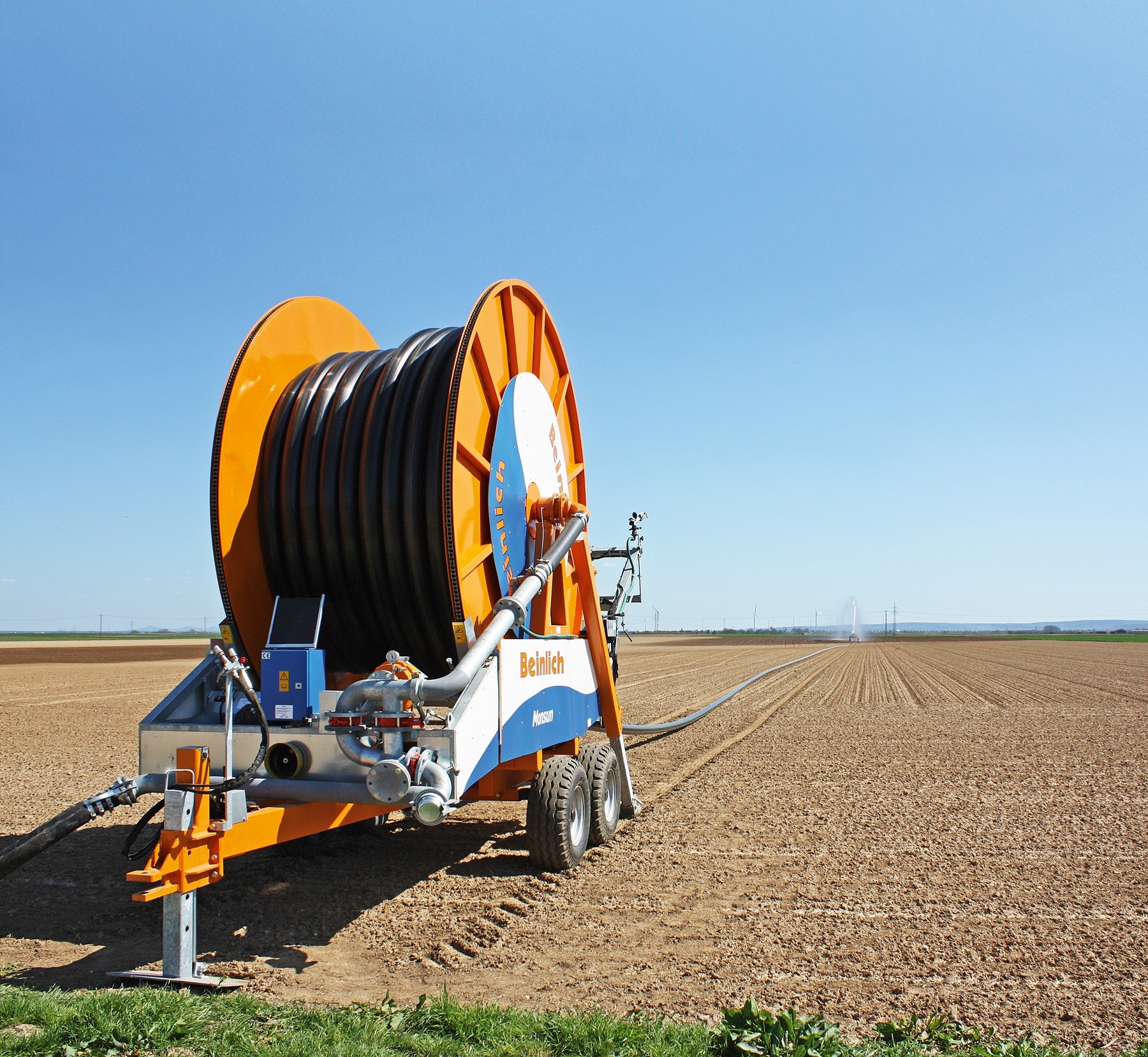 Während des Beregnungsvorgangs muss das PE-Rohr mit einer exakt gleichbleibenden Geschwindigkeit wieder zurück auf die Trommel gespult werden. Nur so kann genau die gewünschte Niederschlagsmenge beregnet werden. Heute bietet Beinlich als führender Hersteller von Großmaschinen als Einziger die 1000 m Länge an. In einer Maschinenaufstellung können bis zu 8 Ha beregnet werden.