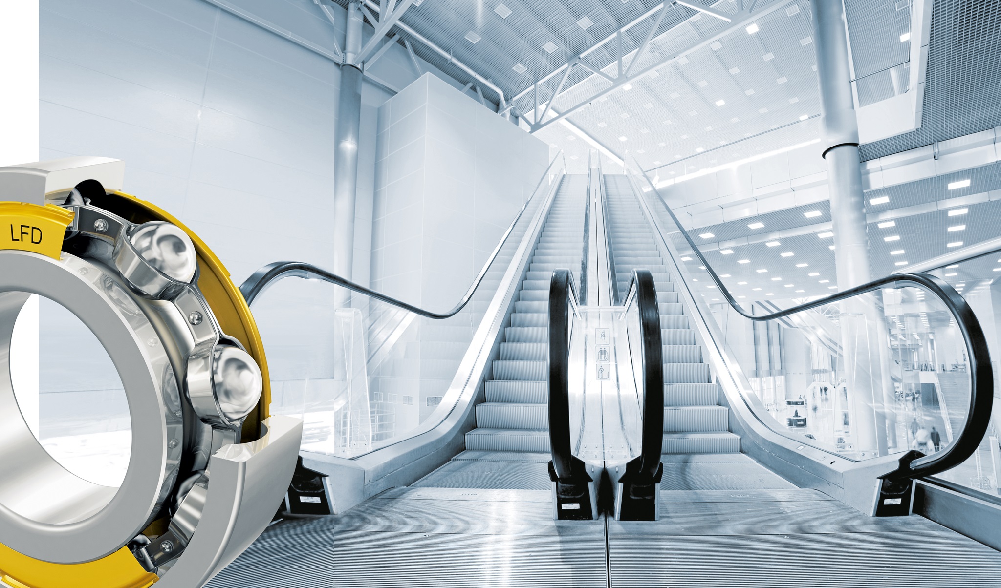 Der Motor setzt über ein Zahnrad die Antriebswelle der Treppe in Gang. Durch den Kettenantrieb werden die Stufen angetrieben. Geräuscharm müssen aber auch die Wälzlager sein. Die einzelnen Stufen des Stufenbandes sind jeweils mit zwei vorderen und zwei hinteren Führungsrollen ausgerüstet. Diese werden über Führungsschienen in positionsabhängig definierter Lage geführt. Pro Stufe kommen allein vier Lager zum Einsatz, die jeweils durch eine Achse verbunden sind. Durch die paarweise gegenüberliegend in Rollen angebrachten Lager (zum Beispiel 6204 2RS) wird eine zuverlässige Führung ermöglicht und ein Verkippen verhindert. Lager von LFD haben bei den entsprechenden Tests alle Voraussetzungen einwandfrei bestanden und werden daher weltweit eingesetzt. Sie sind geräuscharm, leicht laufend und stark belastbar.